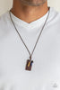 Hanging from the bottom of a double strand of black twine is an urban hook design. Finished in an uneven brown stain, the trendy hook design is complemented with two wooden bead knotted in black twine. Sliding knot closure allows for an adjustable fit.