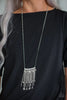 A collection of oval and round silver links, embellished with a faceted white bead suspended inside the bottom most round frame, coalesce into a flirty charm as it sways from the bottom of a lengthened dainty silver chain. Features an adjustable clasp closure.
