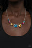 Pearly blue, pink, and purple beads and shimmery silver hoops trickle along glistening silver chains, creating mismatched layers down the chest. Features an adjustable clasp closure.
