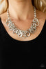 A shiny assortment of flat rectangular and square silver links daringly interlocks across the chest, resulting in a bold industrial centerpiece. Features an adjustable clasp closure.