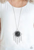 Shiny black beads trickle from the bottom of a glistening silver chain. Shimmery silver hoops cascade from the beads, creating a flirty fringe below the collar. Features an adjustable clasp closure. Sold as one individual necklace. Includes one pair of matching earrings.