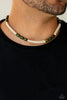 An antiqued silver shield-shaped pendant embossed with a repeating fleur-de-lis pattern is paired with a brass fleur-de-lis charm at the bottom of doubled strands of brown cording. Sliding knots allow for an adjustable fit.
