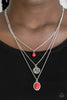 A robust red teardrop pendant swings from the bottom of a lengthened silver chain, adding a perfect pop of color to any outfit. Features an adjustable clasp closure.
