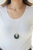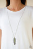 A white rhinestone encrusted silver fitting slants across the top of an oversized oval green rhinestone, creating a glamorous pendant at the bottom of a lengthened silver chain. Features an adjustable clasp closure.
