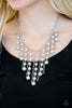 A dainty collection of flat silver teardrops delicately cluster along a dainty silver chain around the neck, resulting in a shimmery fringe. Features an adjustable clasp closure.