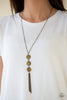 Rectangular brass beads are knotted in place along strands of shiny brown cording, creating a rustic tassel at the bottom of an antiqued brass ring. Features an adjustable clasp closure.