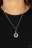 Studded silver teardrops swing from the bottom of a shimmery silver chain. A glowing green moonstone attaches to the innermost frame, creating a whimsical pendant. Features an adjustable clasp closure.
