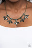 An intense display of mismatched gunmetal chains boldly layer across the chest, resulting in an edgy industrial vibe. Features an adjustable clasp closure.
