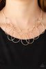 A glassy display of sparkly, glassy, and gold flecked golden and pink beads and pairs of glitzy opalescent rhinestones delicately stacks into an ethereal pendant at the bottom of a gold chain. Features an adjustable clasp closure.