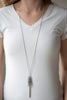Classic smooth bars twist together to form a double-layered arrow that dips below the collar. Accented with classic silver beads and cylinders, an Ultimate Gray cord completes the fashionably modern look. Features an adjustable clasp closure.