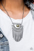 A collection of green, gray, and silver beads are threaded along metallic rods as they swing from the bottom of a shimmery silver chain, creating a flirtatious fringe below the collar. Features an adjustable clasp closure. Sold as one individual necklace. Includes one pair of matching earrings.