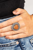 An oversized faceted aurum gem is nestled inside a scalloped brass frame radiating with studded textures, resulting in a radiant centerpiece atop the finger. Features a stretchy band for a flexible fit.