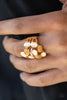 An airy rose gold circle rests atop two arcing rose gold bands, creating a bold minimalistic piece atop the finger. Features a dainty stretchy band for a flexible fit.