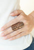 Dotted with a refreshing turquoise stone center, glistening copper filigree climbs the finger, coalescing into a dramatic frame. Features a stretchy band for a flexible fit.