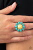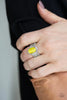 Featuring airy cut-out textures, antiqued silver petals gather around a glowing yellow rhinestone center for a whimsical look. Features a stretchy band for a flexible fit.