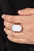 A fiery red stone bead is pressed into the center of an angular silver frame radiating with studded and antiqued textures. Features a stretchy band for a flexible fit.