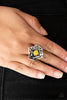 Square cut turquoise stones fan out from an oversized yellow stone center, blooming into an artisan inspired blossom atop the finger. Features a stretchy band for a flexible fit.
