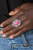 A tranquil asymmetrical pink cat's eye stone is encased in a delicately dotted shimmery silver frame. Dainty sparkly white rhinestones surround the oversized stone creating an elegant centerpiece atop the finger. Features a stretchy band for a flexible fit.