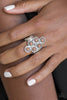 Dotted in dainty white rhinestones, a scalloped silver frame gathers around an oversized green gem atop ornately studded silver bands for a glitzy look. Features a dainty stretchy band for a flexible fit.