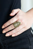 Brushed in a rustic finish, a thick brass frame is dotted and studded in tribal inspired patterns for an artisan inspired look. Features a stretchy band for a flexible fit.