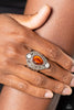 An oversized, square-cut, hematite rhinestone is tilted on a point and framed by tiny hematite gems. As it sits atop a pair of sleek silver bands, the faceted surface of the centerpiece catches and reflects the light of the accents that surround it, magnifying its impressive impact. Features a dainty stretchy band for a flexible fit.