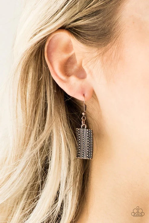 Radiating in studded details, antiqued copper plates link below the collar, joining into a fierce geometric pendant. Features an adjustable clasp closure.